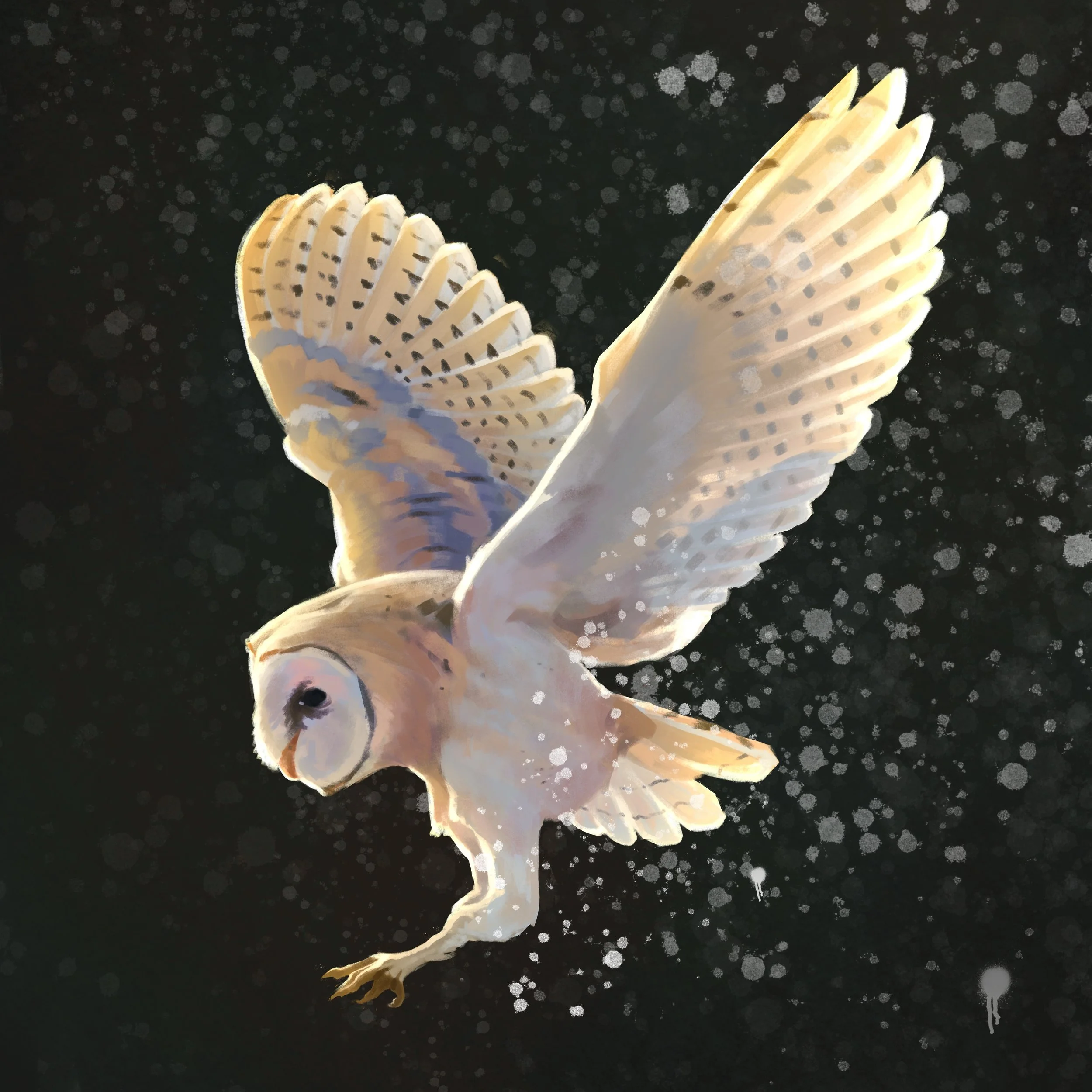 An exercise in lighting and texture that led to an exploration of colors and movement featuring a barn owl in dynamic motion.